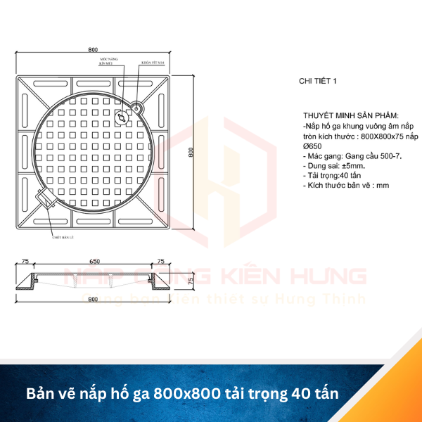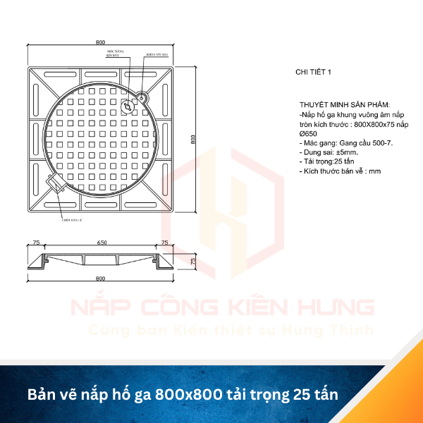 Bản vẽ nắp hố ga gang 800×800 khung âm tải 12.5 tấn
